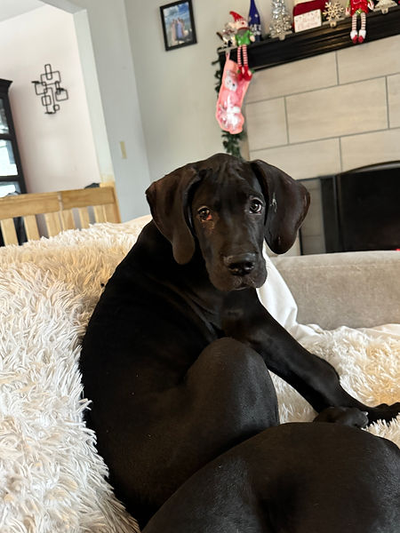 14 Weeks old: This boy is full of energy with a big personality, and the ability to steal your heart!! He loves to play with our adult Danes and share his toys with Mint collar. There was a never a face his hasn't wanted to kiss!